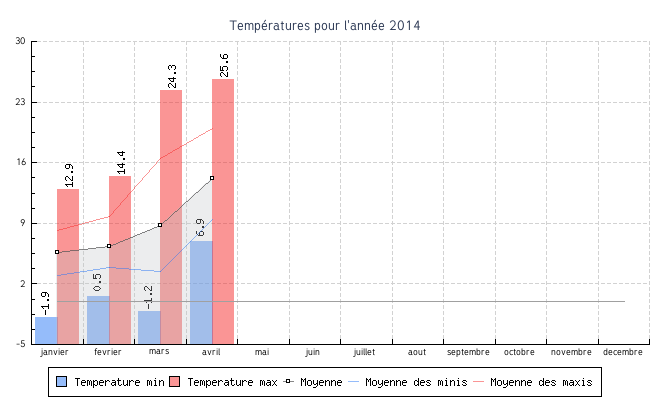 | avril | 6.9 °C | 9.4 °C | 25.6 °C | 20.0 °C | 14.2 °C | 0.4 km/h | 6.1 km/h | SO |